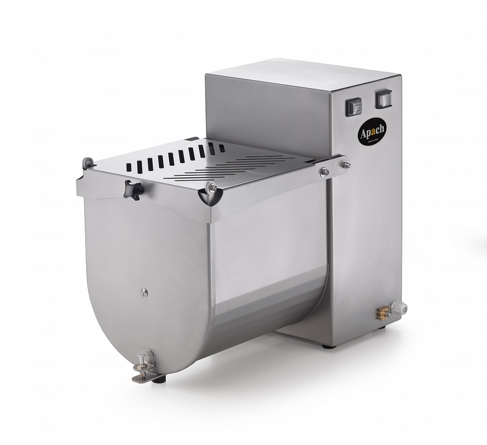 Фаршемешалка Apach AMK20 используется на предприятиях общественного питания и торговли для перемешивания измельченного мяса или рыбы в однородную смесь. Вымешивающее устройство лопастного типа позволяет получить фарш однородной консистенции. Модель оснащена крышкой с микровыключателем и функцией реверса. Корпус и съемная лопасть выполнены из нержавеющей стали.