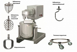 Машина предназначена для механизации процесса взбивания различных кондитерских смесей (белково- и яично-сахарных сливок, муссов, самбуков, сливочных кремов) и картофельного пюре, замешивания жидкого теста, а также для перемешивания мясного и творожного фарша. В комплект машины входит бак ёмкостью 25 л из качественной нержавеющей стали.