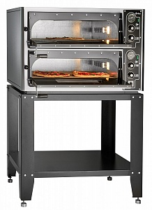 Две камеры. Каждая камера вмещает 4 заготовки для пиццы диаметром 350 мм и имеет раздельную регулировку мощности верхних и нижних ТЭНов. Рабочий диапазон температуры духовки +20...+450 С. Установленный аварийный термовыключатель предохраняет шкаф от перегрева свыше +500 С. Облицовка выполнена из окрашенного металла, дверка и рамка камеры из эмалированного, а жарочный шкаф из оцинкованного листа толщиной 1,5 мм. Поды из жаропрочного камня толщиной 20 мм.