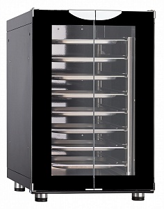 Основной режим работы - расстойка при температуре 45 °С и влажности 50-95%. Лоток для сбора конденсата. Внутренняя поверхность рабочей камеры выполнена из черного металла, покрытого высококачественной эмалью. Регулируемые по высоте ножки.