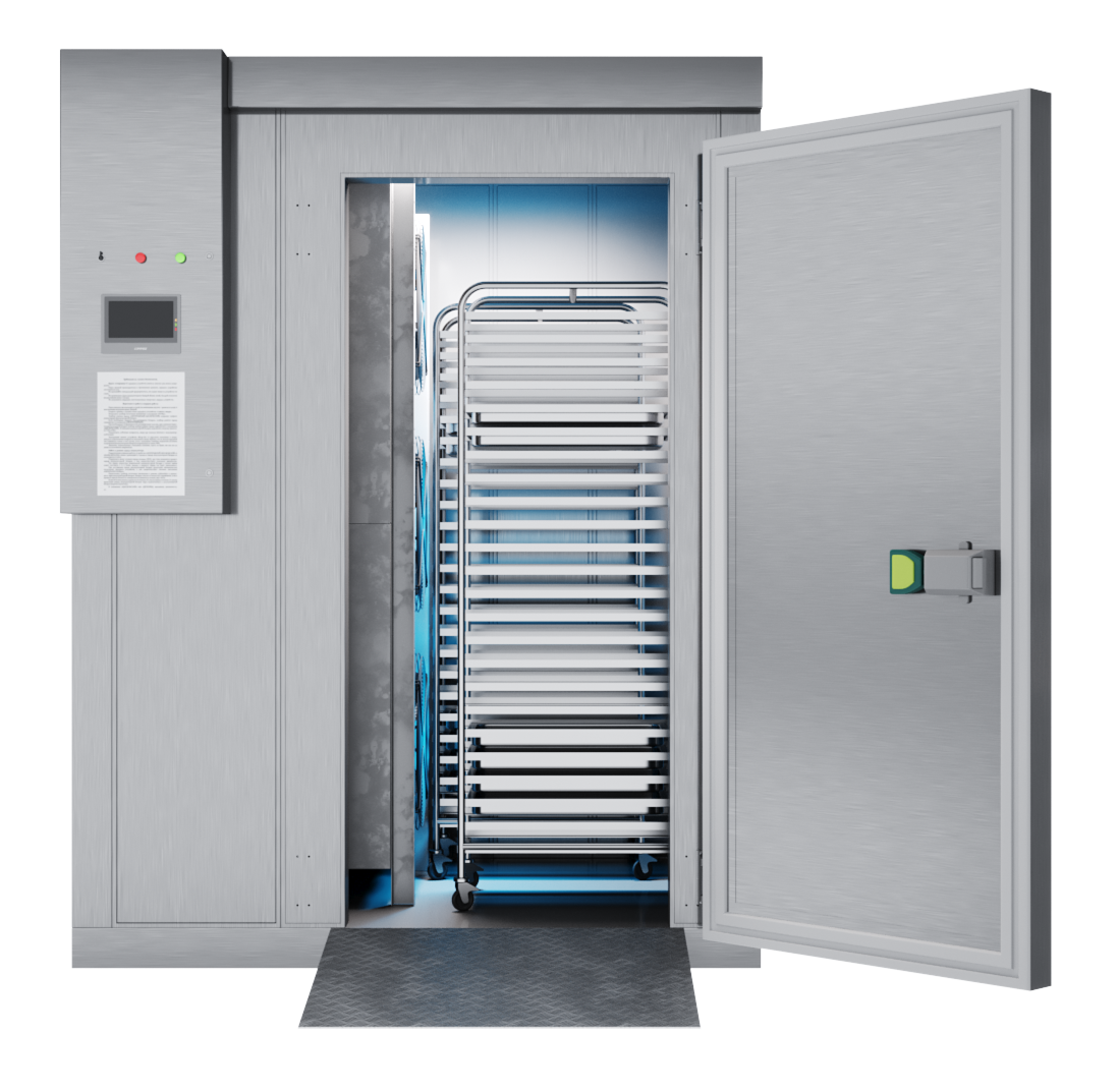 Камера шоковой заморозки для размещения 2-х тележек под гастроёмкости GN1/1 или 1 тележки под гастроёмкости GN2/1 или поддонов EN60x80 (20 уровней).
