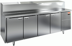 Внутри стола расположен воздухоохладитель с вентиляторами, которые обеспечивают равномерное и быстрое распределение холодного воздуха внутри полезного объема стола. В полезном объеме предусмотрены полки-решетки для укладки продуктов в герметичной упаковке. Нагрузка до 50 кг на каждую полку.