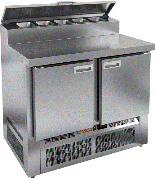 Охлаждаемый стол для пиццы HICOLD PZE2-11/GN (1/6H) выполнен из нержавеющей стали . Верх стола накрыт столешницей.