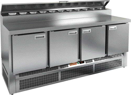 Внутри стола расположен воздухоохладитель с вентиляторами, которые обеспечивают равномерное и быстрое распределение холодного воздуха внутри полезного объема стола. В полезном объеме предусмотрены полки-решетки для укладки продуктов в герметичной упаковке. Нагрузка до 50 кг на каждую полку.