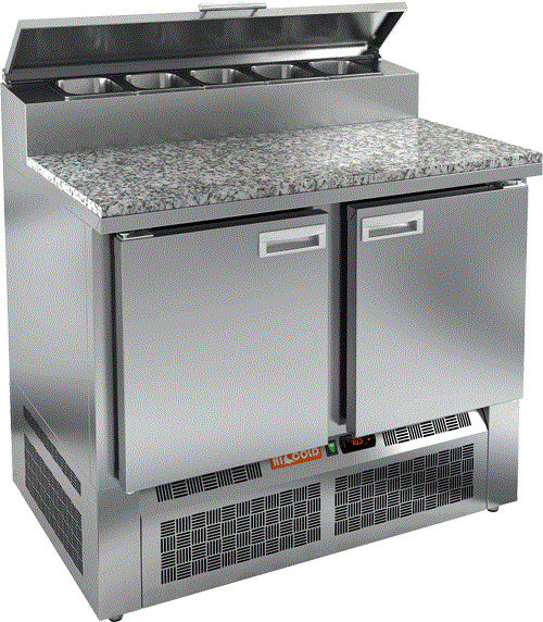 Охлаждаемый стол для пиццы HICOLD PZE2-11/GN (1/6H) выполнен из нержавеющей стали . Верх стола накрыт столешницей.