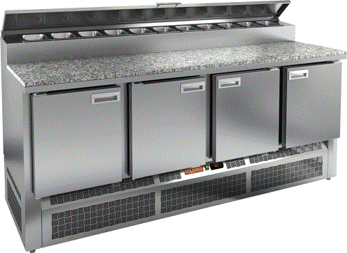 Охлаждаемый стол для пиццы PZE2-1111/GN (1/6H) выполнен из нержавеющей стали . Верх стола накрыт каменной столешницей.