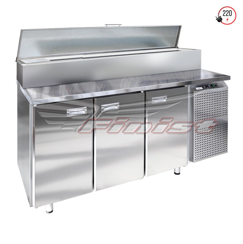 Среднетемпературный холодильный стол для пиццы СХСпц-700-3, 1810*700*860/1070, 3 двери, надстройка для GN 1/3, tº - 2 до +8 Сº, мощность 0,5кВт, напряжение 220В боковое расположение агрегата, нерж.сталь (задняя стенка оцинкованная сталь). Глубина рабочей поверхности 320 мм.