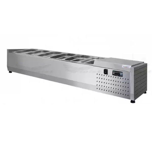 Холодильная настольная витрина ToppingBox открытая предназначена для демонстрации и кратковременного хранения подготовленных начинок/топпингов (для пиццы, блинов, лапши WOK), а также мясных изделий и полуфабрикатов на предприятиях быстрого питания и торговли. Пониженная температура позволяет в течение длительного времени сохранять вкусовые качества, внешний вид иструктуру продуктов. Прибор оснащен статическим охлаждением. Гастроемкости GN1/3 и GN1/2 глубиной 150мм приобретаются отдельно. Холодильная витрина - хорошее дополнение к холодильному столу или блинной станции.