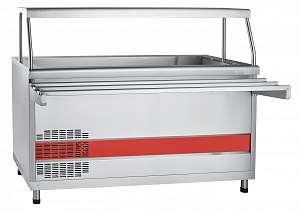 Прилавок холодильный с охлаждаемой ванной используется на предприятиях общественного питания для нескольких задач: демонстрация и раздача холодных закусок, третьих блюд и охлажденных напитков потребителям, а также их хранение при заданной температуре. Диапазон температуры плавно регулируется от 1 до +10°С. Охлаждаемая ванна прилавка холодильного Abat имеет большую полезную площадь, удобна для выкладки напитков в бутылках, а ее поверхность легко подвергается гигиенической чистке. Размещенная полка над прилавком холодильным Abat используется для выкладывания порций и напитков, не требующих охлаждения. Полка оснащена лампой подсветки.Внизу прилавка холодильного расположен открытый нейтральный шкаф для хранения кухонного инвентаря. В комплект к прилавку входит ванна, полка и направляющие для подносов. Оснащен регулируемыми по высоте ножками. Все элементы изготовлены из нержавеющей стали.
