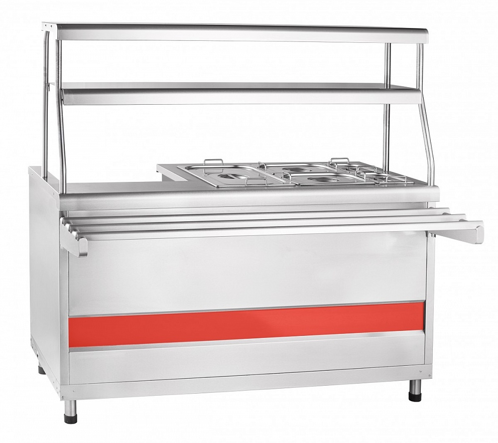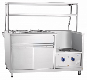 Предназначен для хранения в горячем виде первых и вторых блюд в гастроемкостях и наплитной посуде и их раздачи. Одна конфорка для наплитной посуды и паровая ваннаа с гастроемкостями для вторых блюд. Двойная полка с подсветкой. Нейтральный шкаф. Регулируемые ножки