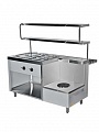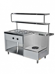 Мармит универсальный первых и вторых блюд предназначен для демонстрации, кратковременного хранения и раздачи посетителям супов, бульонов, каш, а также вторых блюд и соусов в горячем состоянии. Над мармитом расположена двухярусная полка, на которой размещаются порционные блюда. Мармит комплектуется гастроемкостями GN-1/1, GN-1/2, GN-1/4.