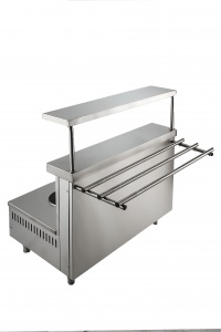 Мармит первых блюд предназначен для временного поддержания в горячем виде супов, бульонов и каш. Расположенная на высоте тележек полка с конфорками позволяет легко перемещать тяжёлую наплитную посуду для хранения на мармит. Над мармитом расположена полка, на которой размещаются порционные блюда.