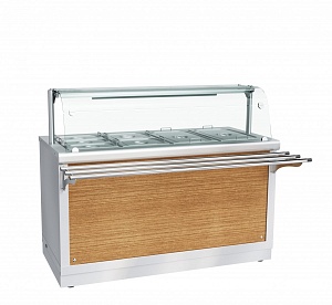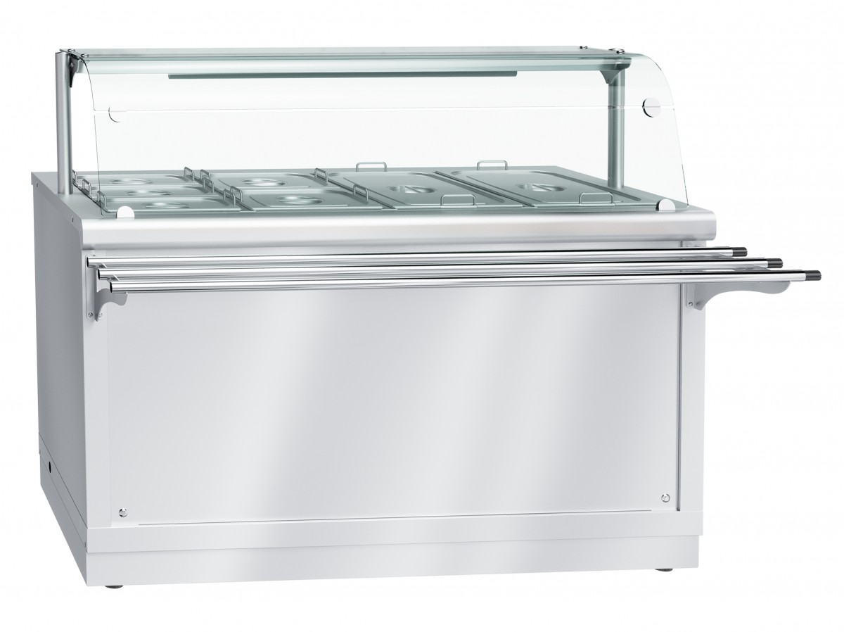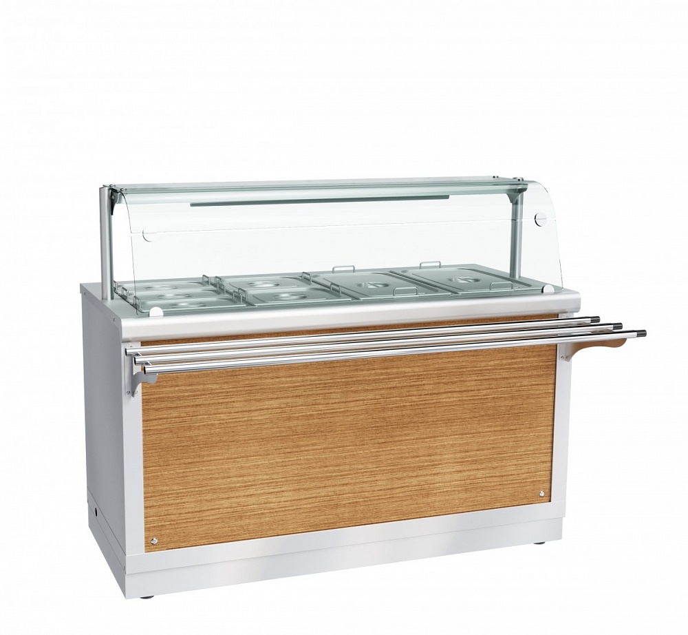 Электрический мармит кухонный 2-х блюд ЭМК-70Х-01, 1500 мм, паровой, +30…+80 С, с гастроемкостями, 1 стеклянная полка, LED-подсветка, съемный нерж. фасад, направляющие в комплекте. Линия раздачи "HOT-LINE" изготавливается по заказу с панелями только из нержавеющей стали! Дополнительно можно приобрести комплект торцевого и комплект колес.