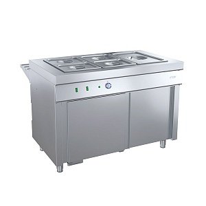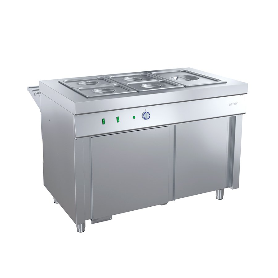 Тип подогрева гастроемкостей — «сухой». В ванну могут устанавливаться гастроемкости GN 1/1 максимальной глубиной 150 мм – 3 шт. Чтобы установить в ванну гастроемкости GN 1/2, 1/3, в комплект поставки входят съемные перемычки из нержавеющей стали П-образной формы.