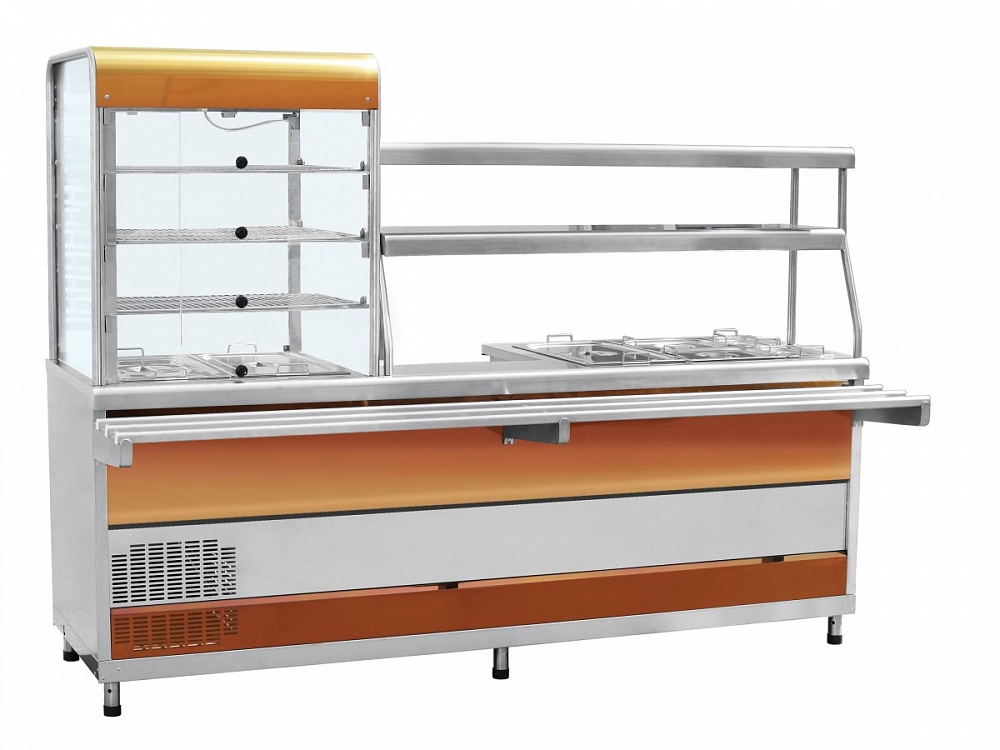 Прилавок-витрина холодильный мармитный универсальный ПВХМ -70КМУ цветной предназначен для кратковременного сохранения: холодных закусок в витрине, а также первых и вторых блюд в гастроёмкостях в горячем состоянии и раздачи их потребителям.