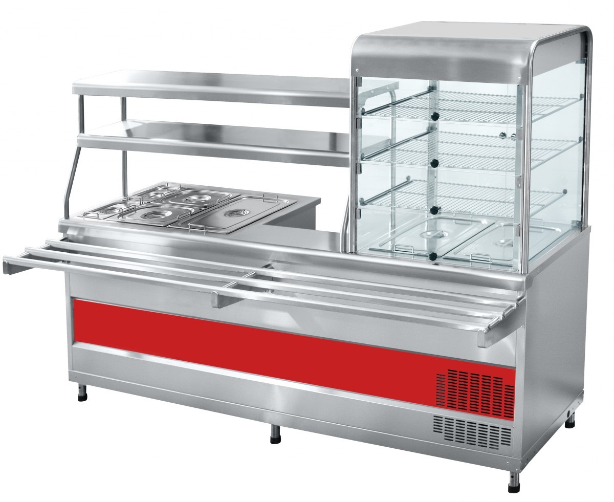 Прилавок-витрина холодильный мармитный универсальный ПВХМ -70КМУ предназначен для кратковременного сохранения: холодных закусок в витрине, а также первых и вторых блюд в гастроёмкостях в горячем состоянии и раздачи их потребителям.