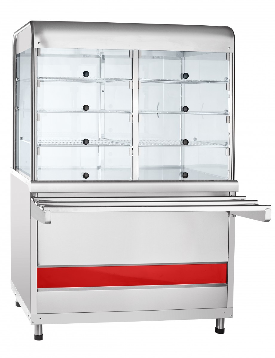 Прилавок-витрина нейтральный ПВН-70КМ предназначен для кратковременного хранения мелкоштучных хлебобулочных и кондитерских изделий, а также других пищевых продуктов на тарелках и для раздачи их потребителю. Витрина имеет три ряда полок-решеток. Две лампы подсветки. Внизу нейтральный шкаф с полкой для хранения инвентаря и продуктов. Регулируемые по высоте ножки. Направляющие входят в комплект поставки.