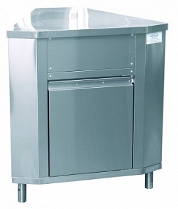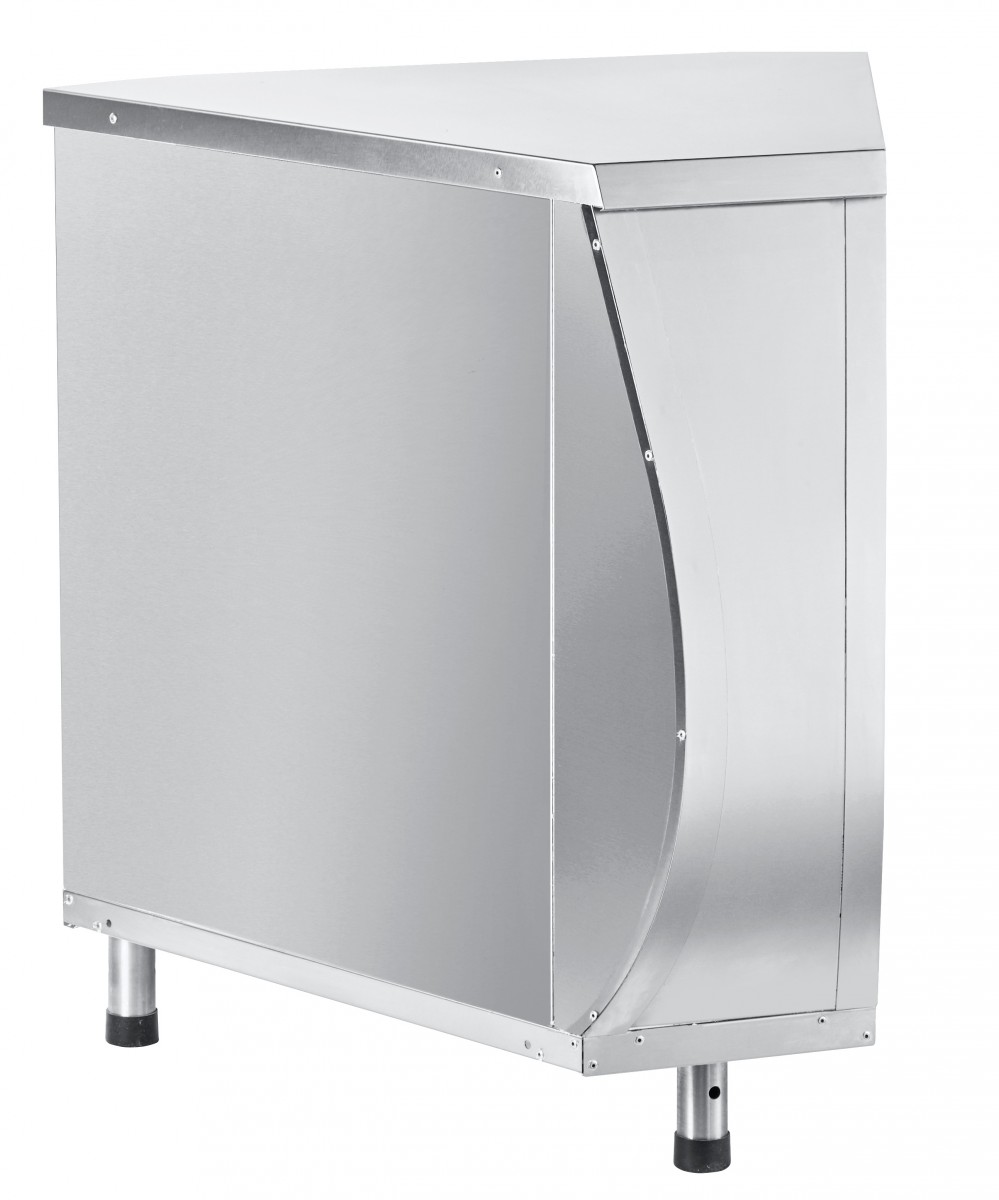 Модуль поворотный внешний служит в качестве нейтрального стола, одновременно позволяя выстраивать технологическую линию под углом 45*, не разрывая линию направляющих для подносов. Все элементы модуля изготовлены из нержавеющей стали. В комплект входят направляющие для подносов. Ножки регулируются по высоте.
