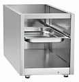 Открытая с лицевой стороны нижняя полка. Направляющие для одной гастроемкости размером GN 1/1. Регулируемые по высоте ножки.