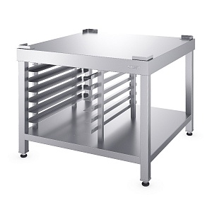 Стойки подставки, выполненные из трубы прямоугольного сечения, оснащены специальными направляющими, позволяющими устанавливать на них гастроемкости. В нижней части конструкции расположена практичная полка, а в верхней части, по углам, установлены упоры, которые позволяют предотвратить падение пароконвектомата. Все детали подставки выполнены из высококачественной нержавеющей стали AISI 304. При необходимости конструкция может быть разобрана.