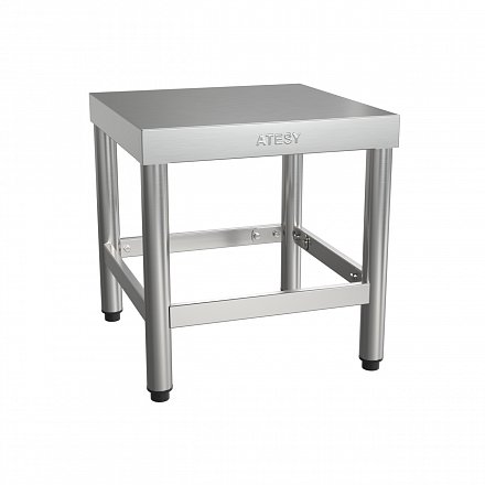 Конструкция подтоварника разборная. Материал столешницы – нержавеющая сталь AISI430 толщиной 0,8 мм. Края столешницы имеют подгиб для предотвращения травматизма персонала. Стойки каркаса выполнены из нержавеющей трубы Ø40 мм стали AISI 201 с приваренными уголками для крепления столешницы (в верхней части) и усиливающих перемычек (в нижней части). В стойки запрессованы регулируемые по высоте пластиковые ножки, позволяющие изменять высоту подставки в пределах 20 мм, пластиковое основание, не повреждает половое покрытие при эксплуатации подставки.