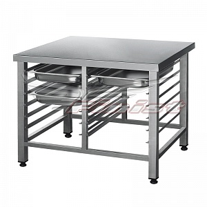 Предназначена для установки печей и пароконвектоматов. Каркас сварной полностью выполнен из профильной нержавеющей трубы и оснащен регулируемыми по высоте полиамидными опорами. Подставка оснащена направляющими для хранения гастроемкостей. Выдерживает нагрузку до 300 кг. В стандартном исполнении 1 ряд – 6 уровней гастроемкостей GN 1/1 530×325. Возможно изготовление подставки с любым необходимым количеством направляющих для хранения гастроемкостей.