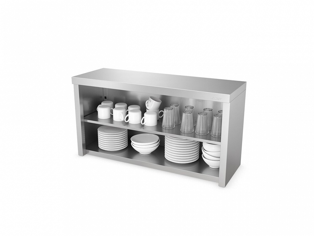 Полка полуоткрытая без дверок ППК-С-1500.420.640-02 (ППК-1500) - серии Стандарт используется на предприятиях общественного питания и торговли для открытого хранения и демонстрации наиболее часто используемой посуды, кухонного инвентаря и продуктов питания, требующих вентиляции. Полка выполнена из нержавеющей стали AISI 430, дно и задняя стенка - из оцинкованной стали толщиной 1,2 мм.
