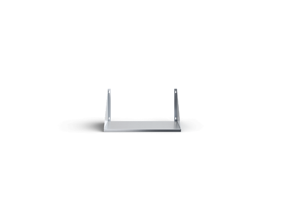 Полка настенная выполнена из из стали марки AISI 430 и толщиной 0,8 мм. Состоит из двух уголков косынок и одной полки. Максимально рекомендуемая равнораспределенная нагрузка на полку - 40 кг.