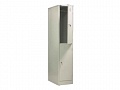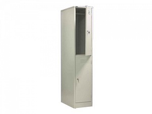 Шкаф металлический разборной односекционный, с 2-мя отделениями. Предназначен для хранения сменной одежды в раздевальных комнатах спортивных залов, бассейнов, школ и т.д. Каждое отделение шкафа оснащено индивидуальным врезным замком и перекладиной для вешалки. Покрытие - полимерное порошковое серого цвета (RAL 7035).
