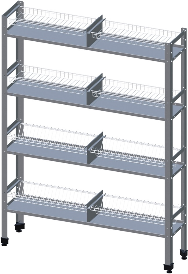Напольный кухонный стеллаж VIATTO ПКТ-4-Н-ЮТ предназначен для хранения или сушки тарелок и столовых приборов. Изготовлен из нержавеющей стали AISI 430, сетки хромированные. Ножки регулируются по высоте.
