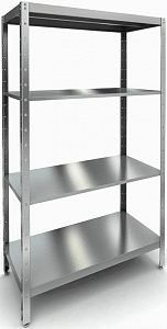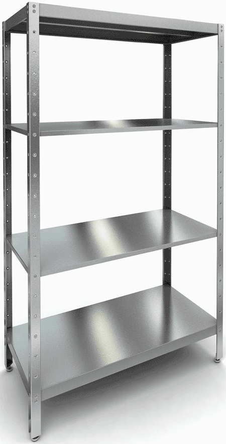 Описание Конструкция стеллажей сборно-разборная. Стойки стеллажей из оцинкованного уголка 40х40мм имеют дополнительную отбортовку и комплектуются регулируемыми опорами. Полки из шлифованной нержавеющей стали марки 430 усилены дополнительными ребрами жесткости. Распределённая нагрузка на полку 100кг, сосредоточенная нагрузка не более 50кг.