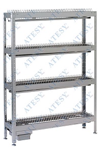 Стеллаж СКТ-1200 выполнен из пищевой нержавеющей стали. Он содержит четыре полки-кассеты, расположенные каскадным образом. Кассета представляет собой решетку из прутка, в ячейки которой помещаются тарелки. Каждая полка рассчитана на 45 тарелок. В поддоне предусмотрен небольшой уклон, обеспечивающий сток жидкости, поступающей с мокрой посуды к сливному отверстию. В нижней части стеллажа устанавливается емкость для сбора воды со всех полок-кассет.