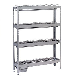 Разработанная на предприятии система крепления полок, обеспечивает жесткость конструкции стеллажа. Ножки стеллажа снабжены регуляторами высоты, позволяющими устранять возможные неровности пола. Опоры регуляторов высоты не подвержены коррозии, так как выполнены из оцинкованной стали.
