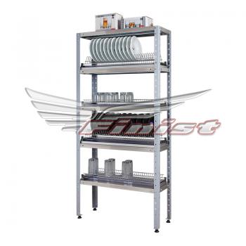 Стеллаж предназначен для использования в технологических помещениях предприятий общественного питания для сушки кухонной посуды и инвентаря. Полки выполнены из пищевой нержавеющей стали. Каркас стеллажа разборный. Стеллажи имеют 5 полок, две из которых предназначены для сушки тарелок, а две для сушки стаканов.