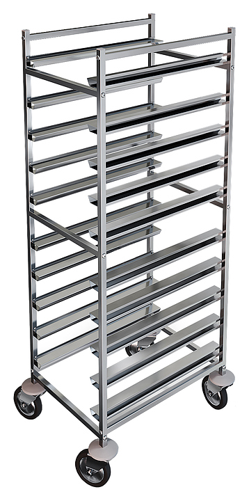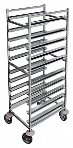 Стеллаж-шпилька СТР-330/604У для противней, 610*440*1500 предназначен для транспортировки и хранения противней на предприятиях общественного питания и торговли. Модель оснащена 4 поворотными колесами, 2 из которых с тормозными устройствами и отбойниками. Каркас выполнен из квадратной трубы 20х20 мм из нержавеющей стали AISI 304, полозки - из нержавеющей стали AISI 430 толщиной 1,0 мм, отбойники - из пластика, колеса покрыты резиной.