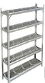 Стеллаж кухонный. Стойки из нержавеющей стали AISI 430, полка из нержавеющей стали AISI 430 с кассетами из пищевого пластика на 250 тарелок, поддон из нержавеющей стали AISI 304. Используются в моечном отделении для сушки и кратковременного хранения чистой посуды. Стеллаж сделан из стоек и полок. Полка состоит из кассеты для тарелок и каркаса. Кассета представляет собой решётку с ячейками, в которые помещаются тарелки. Кассета изготовлена из пищевого пластика, каркас из нержавеющей стали марки AISI 430. Внизу стеллажа расположен поддон, предназначенный для сбора жидкости, поступающей с мокрой посуды. Поддон изготовлен из пищевой нержавеющей стали марки AISI 304. Высота полок регулируется. Шаг регулировки - 100 мм. Ножки стеллажа снабжены регуляторами высоты, что позволяет устранить неровности пола и дополнительные конструктивные элементы, предназначенные для предотвращения его раскачивания во время работы и придающие большую устойчивость. Универсальная конструкция позволяет легко производить сборку стеллажей. При необходимости можно приобрести любое количество полок дополнительно.