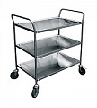 905х560х852 мм., 3 полки, поворротные колеса, используется на предприятиях общественного питания как вспомогательное оборудование. Тележку сервировочную Abat ТС-80 можно применять для транспортировки посуды, столовых приборов и блюд к сервируемому столу, четыре колеса большого диаметра тележки сервировочной Abat ТС-80 – поворотные. Два из них оснащены стопорным механизмом, все детали изготовлены из нержавеющей стали, количество полок: 3 шт.