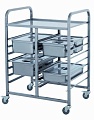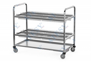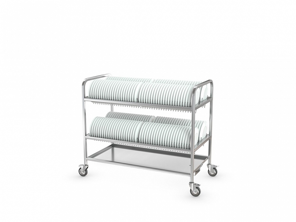 Тележка для тарелок ТТ-Л-2-1200.600-02 (ТТ-2) - используется на предприятиях общественного питания и торговли для временного хранения, транспортировки и естественной сушки тарелок, блюдец и другой посуды. Сварная конструкция выполнена из высококачественной нержавеющей стали AISI 304. Модель оснащена 4 колесами, 2 из которых снабжены тормозами.
