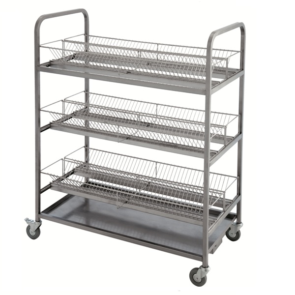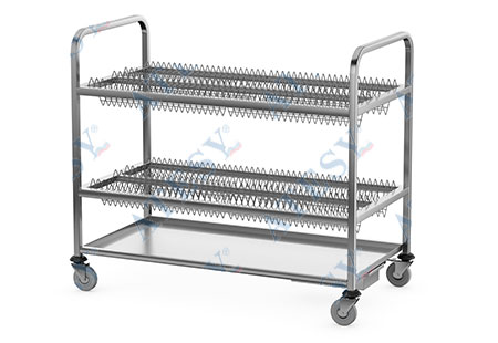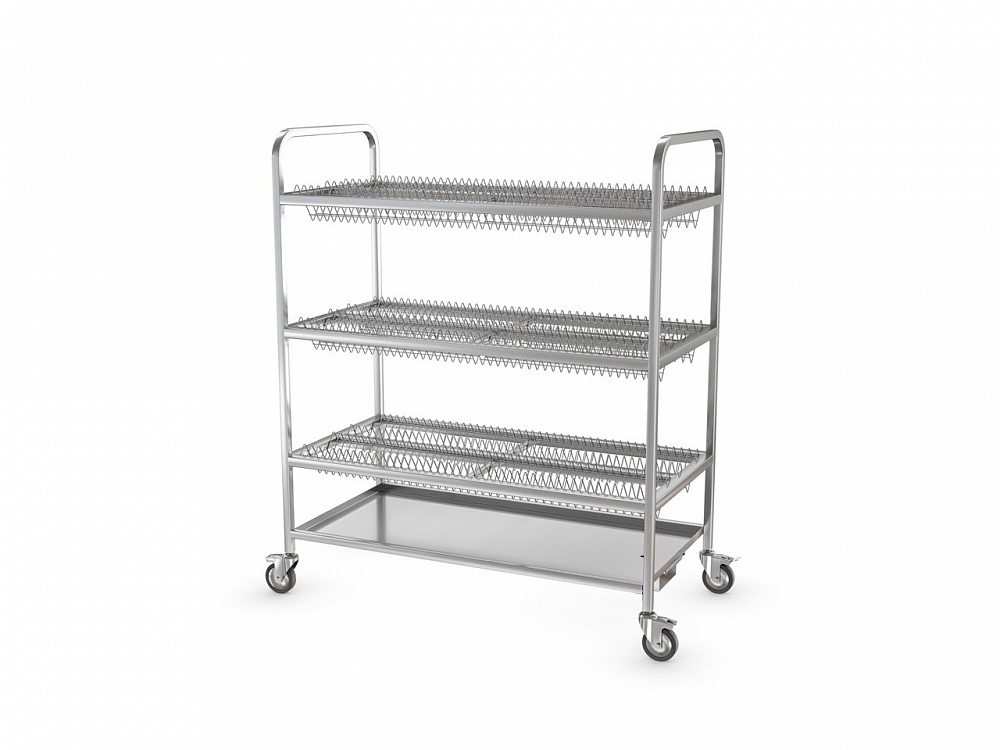 Тележка для тарелок ТТ-Л-3-1200.600-02 (ТТ-3) - используется на предприятиях общественного питания и торговли для временного хранения, транспортировки и естественной сушки тарелок, блюдец и другой посуды. Сварная конструкция выполнена из высококачественной нержавеющей стали AISI 304. Модель оснащена 4 колесами, 2 из которых снабжены тормозами.