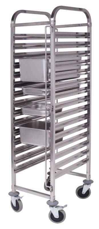 Тележка состоит из двух П-образных стоек, выполненных из квадратной стальной трубы и соединенных перемычками. На стойках расположены 15 пар направляющих для противней и гастроемкостей типоразмера GN 1/1. Тележка установлена на 4 колеса, два из них имеют стопорные механизмы.