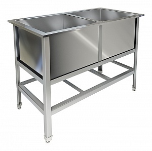 Ванна моечная ВМ-22/600, 1340*700*850 - используется на предприятиях общественного питания и торговли для мытья и ополаскивания продуктов, посуды и различного инвентаря. Модель с закругленными краями оснащена регулируемыми по высоте ножками, что позволяет компенсировать неровности пола. Сварной каркас выполнен из нержавеющей стали AISI 430, сварные мойки - из нержавеющей стали AISI 304 толщиной 0,8 мм, выпуски - из нержавеющей стали.