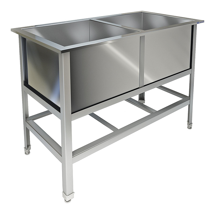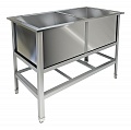 Две сварные емкости размером 700х700х450 из нержавеющей стали марки AISI 304 толщиной 0,8мм. Каркас сварной из уголка 40х40 нержавеющей стали марки AISI 430 толщиной 2мм, внизу по периметру обвязка. Ванна комплектуется выпуском с нержавеющей решеткой и механическим запорным клапаном, диаметр выпуска 90мм, диаметр подключаемого сифона 50мм, регулируемые опоры. На дне ванны ребра (лучи) для жесткости и снижения вибрации. Ванна поставляется в собранном виде.