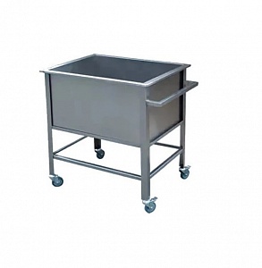 Одна сварная емкость размером 600х500х300 из нержавеющей стали марки AISI 304 толщиной 0,8мм., каркас сварной из трубы 40х20 покрытой порошковой краской серого цвета, толщиной 1,2мм, сливной штуцер из трубы Д33, кран ДУ25 - 1 дюйм. 4 колеса D 125 мм, 2 с тормозом. Ванна поставляется в собранном виде.