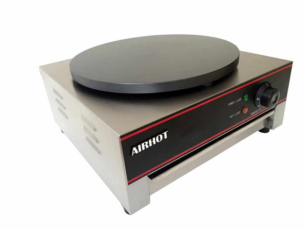Блинница Airhot BE-1 используется на предприятиях общественного питания и торговли. Модель оснащена световым индикатором нагрева и автоматическим поддержанием температурного режима. Корпус выполнен из нержавеющей стали, жарочная поверхность - из чугуна с антипригарным покрытием.