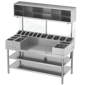 Изделие состоит из стола, холдеров с гастроемкостями и полок. Станция полностью выполнена из высококачественной нержавеющей стали, а ее столешница усилена специальной подложкой из ламинированного ДСП толщиной 16 мм. Передняя часть конструкции оснащена защитным стеклом, позволяющим оградить покупателей от процесса приготовления.