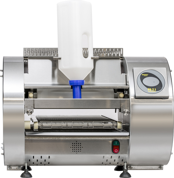 Аппарат блинный автоматический, настольный, производительностью производительность до 180шт./ч, с корпусом из алюминия и нержавеющей стали, рабочей поверхностью из чугуна. В комплекте ёмкость (пластик) на 3л для теста, с наконечниками; полка-держатель, ванночка, валик, копир для блинов D300мм и копир для блинов 300х300мм, стопирующий