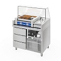 Станция представляет собой закрытый модуль, в виде стола с охлаждаемой камерой (рабочего объема) с гастронормированными ящиками (G1/1 х150мм-2шт, G1/2 х150мм-1шт) и нейтральной нишей для хранения инвентаря: щипцов, салфеток, одноразовой посуды и т.д. Столешницей, предназначенной для