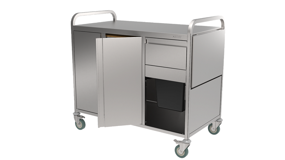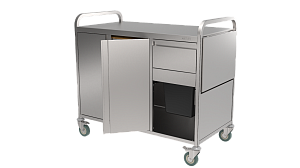Подставка под гриль-шашлычницу ПГШ предназначена для установки и транспортировки гриля-шашлычницы и работы с ним. Детали подставки выполнены из легированной стали. Подставка имеет рамно-стеллажную сварную конструкцию. Стойки выполнены из труб квадратного сечения. Передвижение тележки осуществляется на четырех поворотных колесах диаметром 100 мм, два из которых имеют тормозное устройство. На столешнице установлены резьбовые втулки для фиксации гриля. По бокам столешницы установлены откидные полки. Под столешницей можно разместить выдвижную разделочную доску (заказывается отдельно) с гастроемкостью для сбора нарезанных продуктов, ящик для инвентаря (заказывается отдельно), выдвижную урну (заказывается отдельно). На стойках подставки установлены направляющие для гастроемкости, которую можно использовать в качестве полки, делящей пространство.