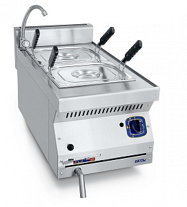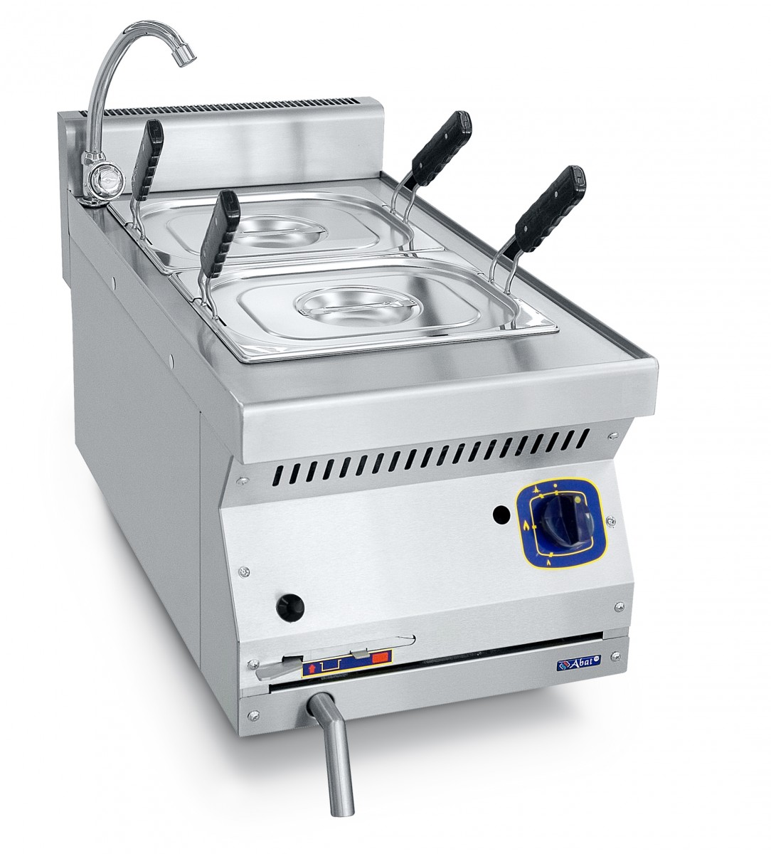 Удобные ручки позволяют быстро и безопасно вынимать корзины с готовыми продуктами из воды. Регулируемые по высоте ножки. Слив воды осуществляется из крана, расположенного на передней панели газоварки.
