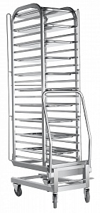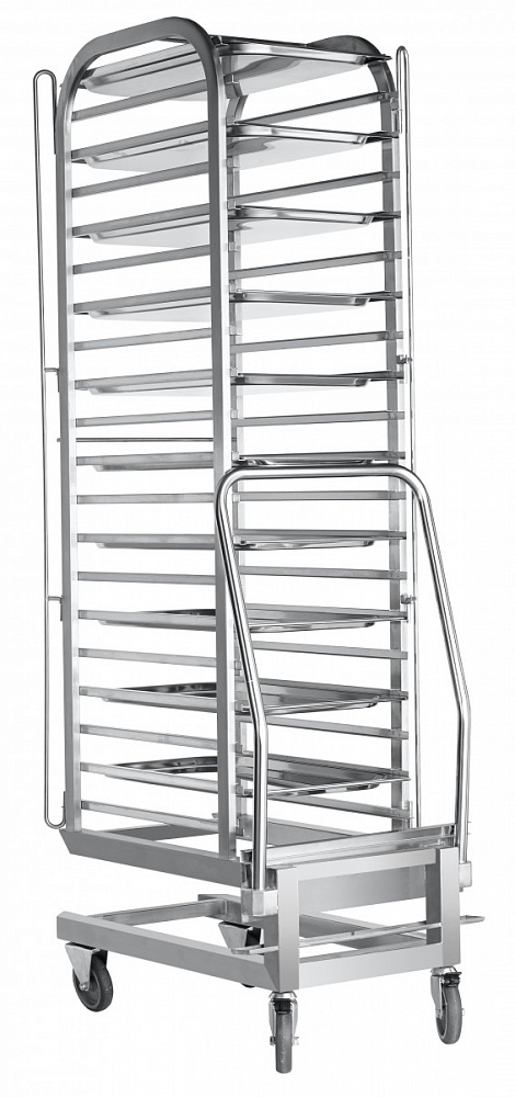 Тележка передвижная ТП-20-1/1 является вспомогательным оборудованием, вмещает 20 гастроемкостей, размером GN 1/1, и используется для их транспортировки и установки в 20-ти уровневом пароконвектомате ПКА-20-1/1 ПП. Имеет съемную ручку для транспортировки и поворотные колеса. Изготовлена из нержавеющей стали.